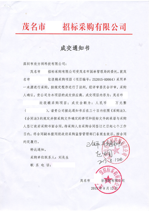 茂名市招標采購有限公司成交通知書: