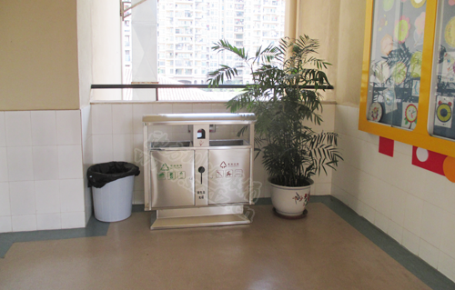 在校園里轉了一圈,廚房門口以廚余垃圾筒為主;科學教室以有害垃圾桶為主。全校每個教室都放置了小號的藍色可回收垃圾桶和黑色其他垃圾桶,并在垃圾筒上分別貼上了投入該筒的垃圾種類。