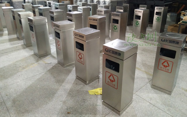 這批投放深圳石巖的C516商場不銹鋼垃圾桶尺寸規格為300*300*870mm,采用1.0mm厚的優質201不銹鋼板材經激光切割剪板下料,數控折彎各部件,由多年經驗的鈑金師傅焊接焊點平滑美觀,打磨拋光等鈑金工藝制作而成。深圳石巖商場室內不銹鋼垃圾桶邊角圓弧設計有效防止顧客撞擊,表面打磨拋光在使用過程中不傷手。桶頂部分翻蓋投口設計,桶身開口垃圾投放,垃圾多方位投放更便捷,絲印商場標識及垃圾分類標識。