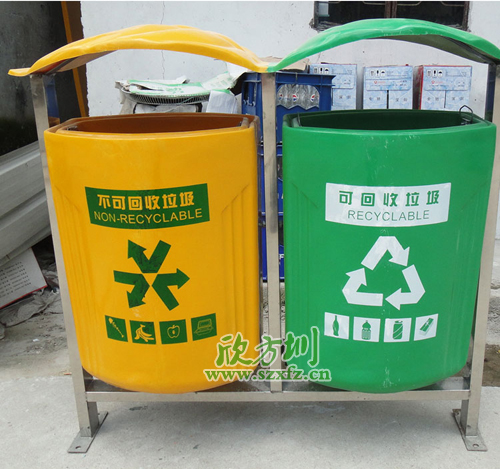 這款A26玻璃鋼環保分類垃圾桶,桶的規格為:1040*420*1100,是采用優質玻璃纖維與進口樹脂著色合成,采用模具一次成型。玻璃鋼造型精美、潔凈、美觀、醒目、不退色,它具有強度高、耐腐蝕、耐酸堿、抗老化、太陽暴曬下 不變形、抗紫外線、操作方便等特點是其他材質無法取代的。廣西博白學校的負責人來我們工廠參觀后,頻頻點頭,非常滿意!欣方圳垃圾桶都是以滿足客戶為先,這才是真的好。