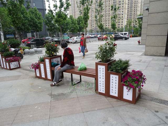 欣方圳市政塑木花箱最大的優點就是在美化了環境的同時,還增加了其使用年限,有限的防止了浪費木材,側面的等于對環境做出了貢獻。另外欣方圳的塑木花箱有限的防止了蟲蟻等的破壞,很多孩子容易被美麗的鮮花所吸引,會離花箱很近,但普通實木花箱時間久,會被腐蝕,里面有很多螞蟻,蟲子,很不衛生,而塑木花箱能有效的防止這一缺憾。還能夠滿足客戶對各種規格、尺寸、形狀、厚度的需求,同時也可提供多種設計、顏色及木紋。還具有與原木相同的加工性能,可釘、可鉆、可切割、粘接,用釘子或螺栓連接固定,表面光滑細膩、無需砂光和油漆。而其油漆附著性好,亦可根據個人喜好上漆。就例如圖上這款花箱上面還能應客戶要求描繪中國魅力的風格。