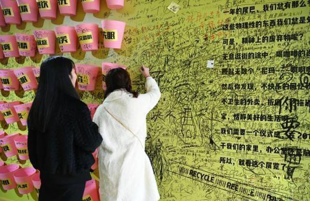 除了這些垃圾收集裝置,垃圾箱內(nèi)的三面?zhèn)葔偷孛嬉渤蔀槭忻裥沟钠脚_(tái),寫滿了戳心的留言。如“扔掉和我媽的溝通不暢”“2018我抑郁癥了,話更少了,希望你不要離開,一起去馬來西亞”……字字句句都反映出當(dāng)代年輕人的生活壓力,以及對(duì)輕松、快樂的渴望。
