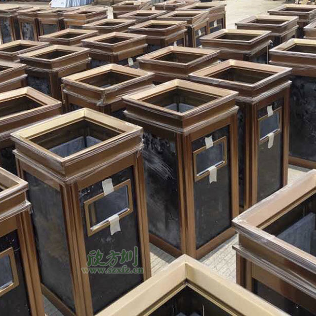 • 產品材質:采用天然的大理石與優質冷軋鋼板或不銹鋼鋼板制作而成,四面大理石用鋼板螺絲固定于桶體,有內桶,方便提倒垃圾,桶頭煙灰盅可放白石子可清洗,鋼板經折彎沖壓一次性成型。產品一律用室外粉靜電噴塑,經過180°的高溫,延長垃圾桶使用壽命,顏色持久不變亮麗如新。