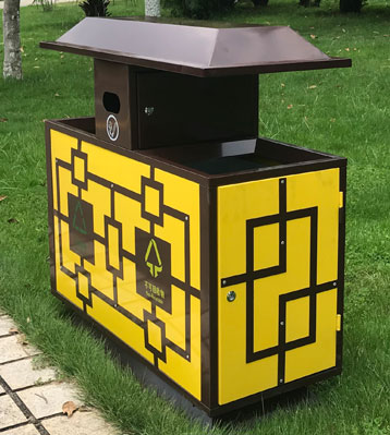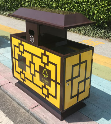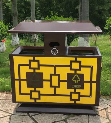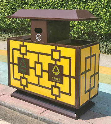 針對古鎮景區戶外垃圾收集的一款外觀中國風復古仿古典風分類垃圾箱,采用優質冷軋鋼焊接成型,經酸洗磷化除油防銹工藝表面做烤漆,美觀艷麗。