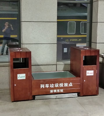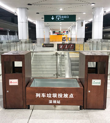 欣方圳列車站臺仿木花箱組合垃圾桶深圳東站實景圖