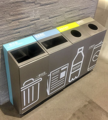 欣方圳商場不銹鋼室內(nèi)滑軌四分類果皮箱批量生產(chǎn)圖